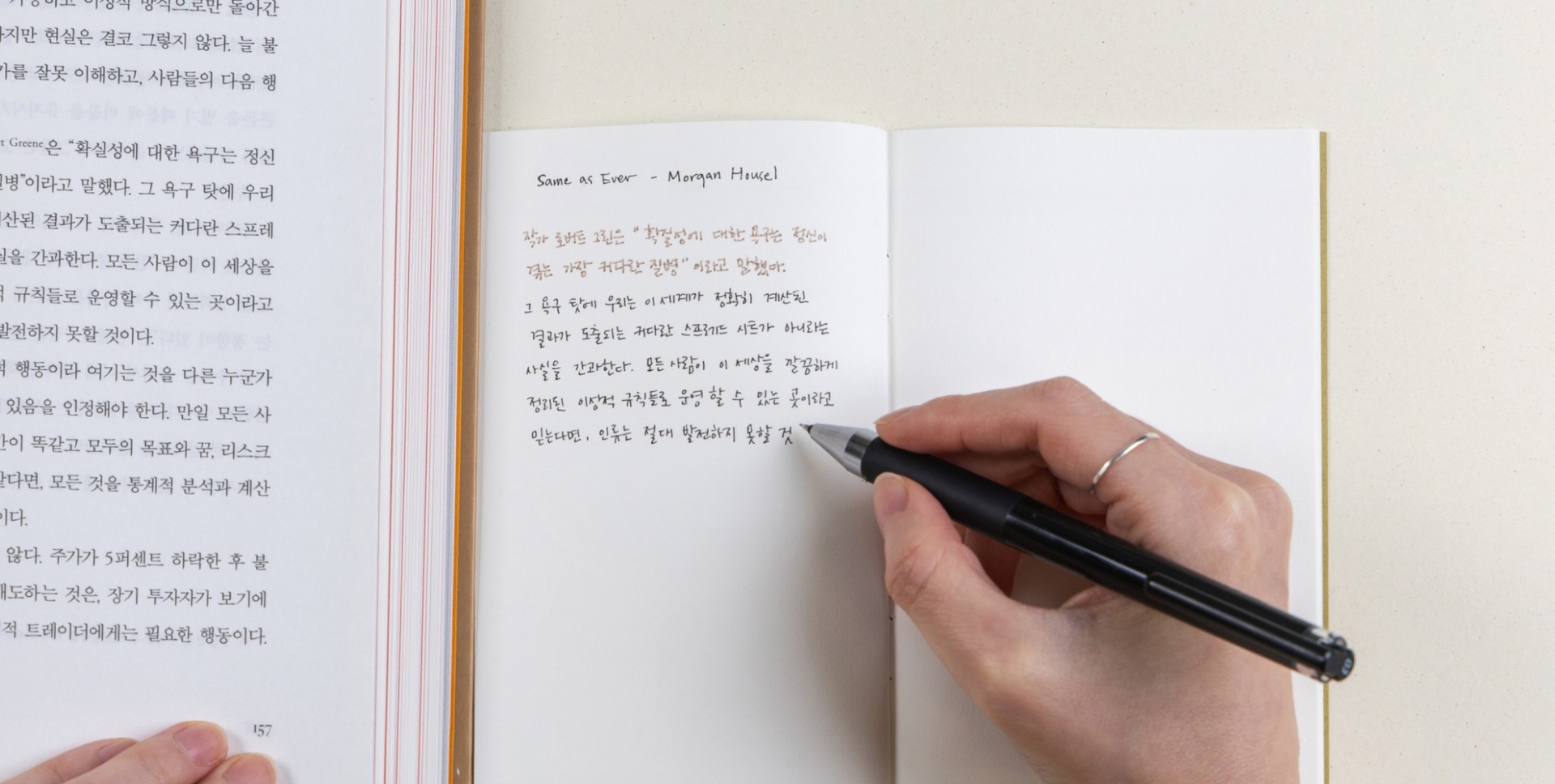 필사 노트는 문학적이어야 할 필요도 없고, 꼭 예쁜 글씨로 써야 할 이유도 없습니다. 단지 지나가는 문장을 잠시 멈춰 세우고, 지금의 내가 좋아하는 것들을 확인하는 시간으로 삼아보세요.