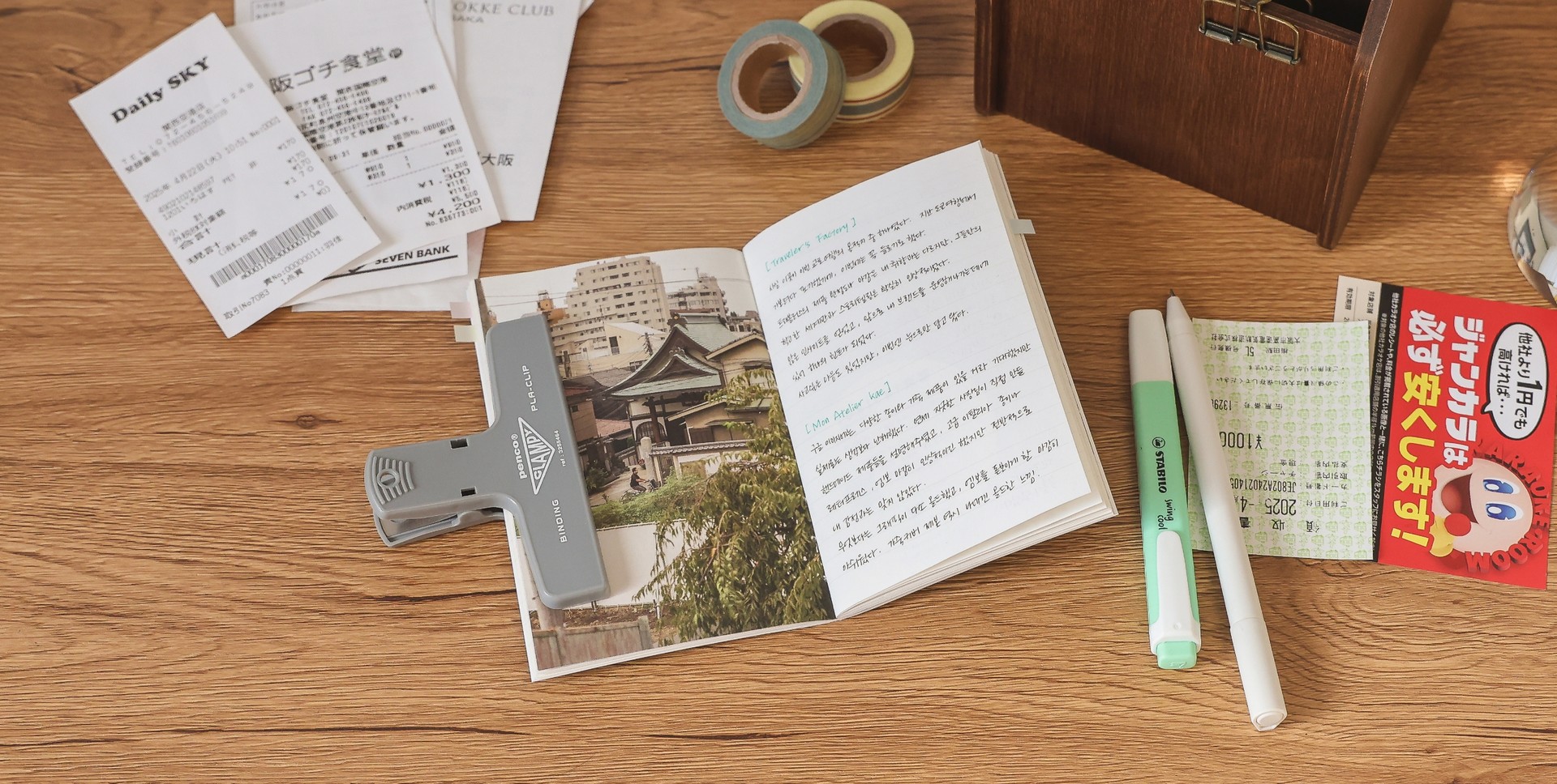 그날 들렀던 카페의 영수증, 박물관 입장 시 받은 티켓, 지하철 노선이 그려진 소형 지도, 호텔 룸키 카드, 길에서 받은 소책자나 스탬프, 버스 시간표… 이런 작고 사소한 종이 조각들이 노트에 붙여지는 순간, 단순한 ‘기록’이 아니라 감각적인 기억의 단서가 됩니다.