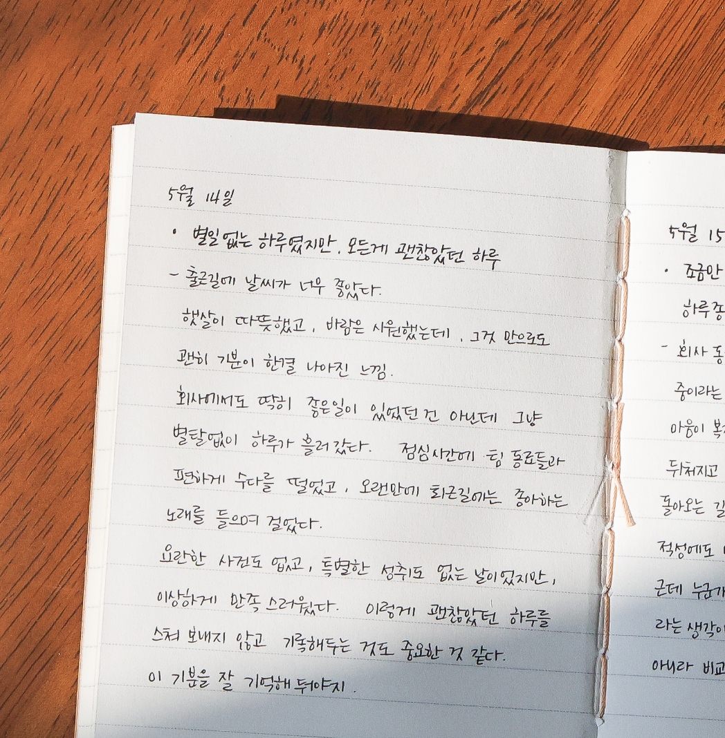 2. 기분이 좋았던 날만 골라 쓰는 ‘좋은 날 노트’를 따로 만들어보는 것도 좋습니다. 반대로 속상했던 날에만 펴는 노트도, 내 감정을 이해하는 하나의 방법이 될 수 있어요.